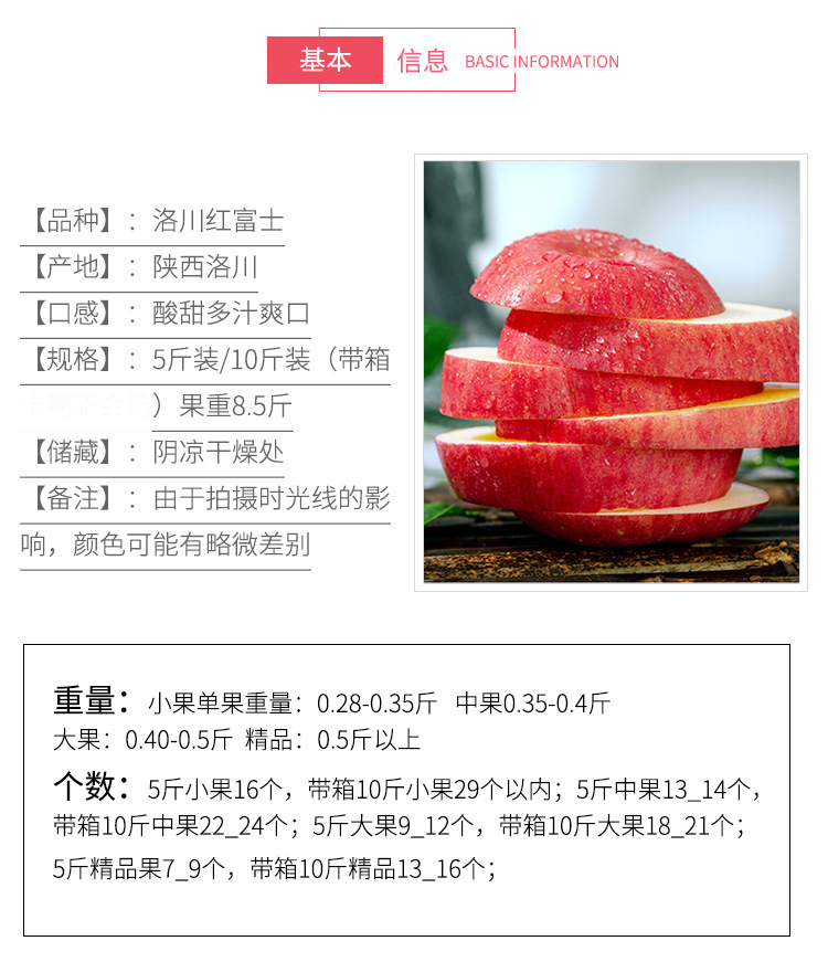 1、产品名称:陕西洛川红富士苹果 2、发货地:陕西 3、鲜果供货周期:9月-12月底 4、默认快递:中通、邮政等快递随机,发顺丰联系客服。 5、包装方式:纸箱+网套 6、,一件代发。 7、一件代发到货区域:除新疆西藏内蒙海南不发,其他地区包邮通发。 8、产品特性/食用说明:脆甜汁水充足。全成熟发货,请。            9、售后赔付标准:签收24小时内把坏果和快递放一起拍照,按坏果个数赔付。轻微碰伤/口感差异不售后。具体重量根据数量,和重量,满格综合得出,因天气原因,快递运输,个别果子因天热会出现个别黑红点,黑红点不超过大拇指均不影响使用不在理赔范围之内,包装种类较多,包装种类不做理赔说明介意者慎拍。 10,五斤装,因快递原因,五斤装下单尽量下2的培数我们发货合并发货十斤装。单数不发货。